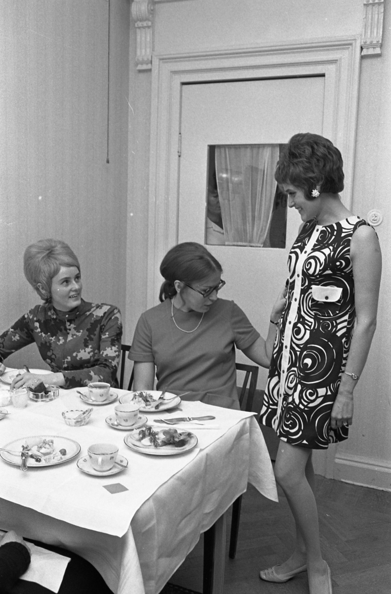 TBV, Tjänstemännens BildningsVerksamhet, ordnar modevisning och bjuder på kaffe och landgång. Ann-Marie Törnqvist (blond) och Gulli Hammarlund studerar mannekängen, Gunilla Magnussons klänning.