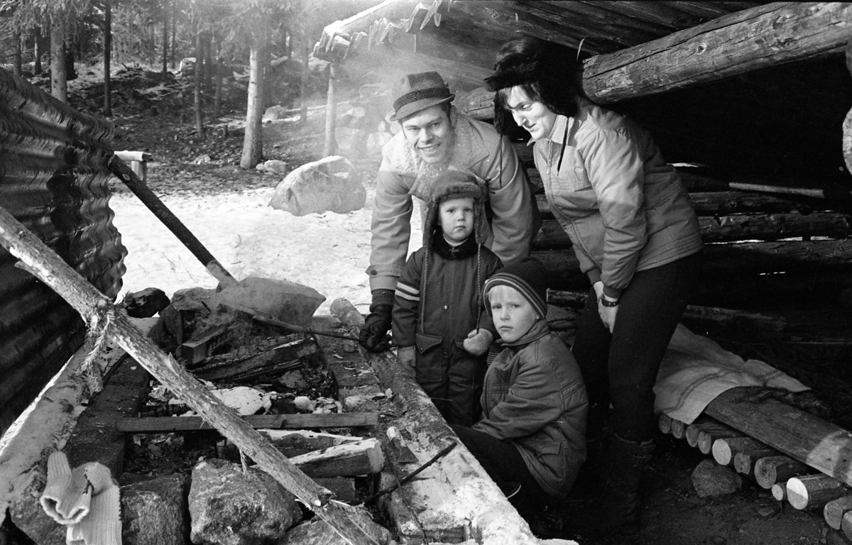 Familj grillar korv vid Maxelmossens vindskydd. Mamman bär ryssmössa. Det är vinter och snö.