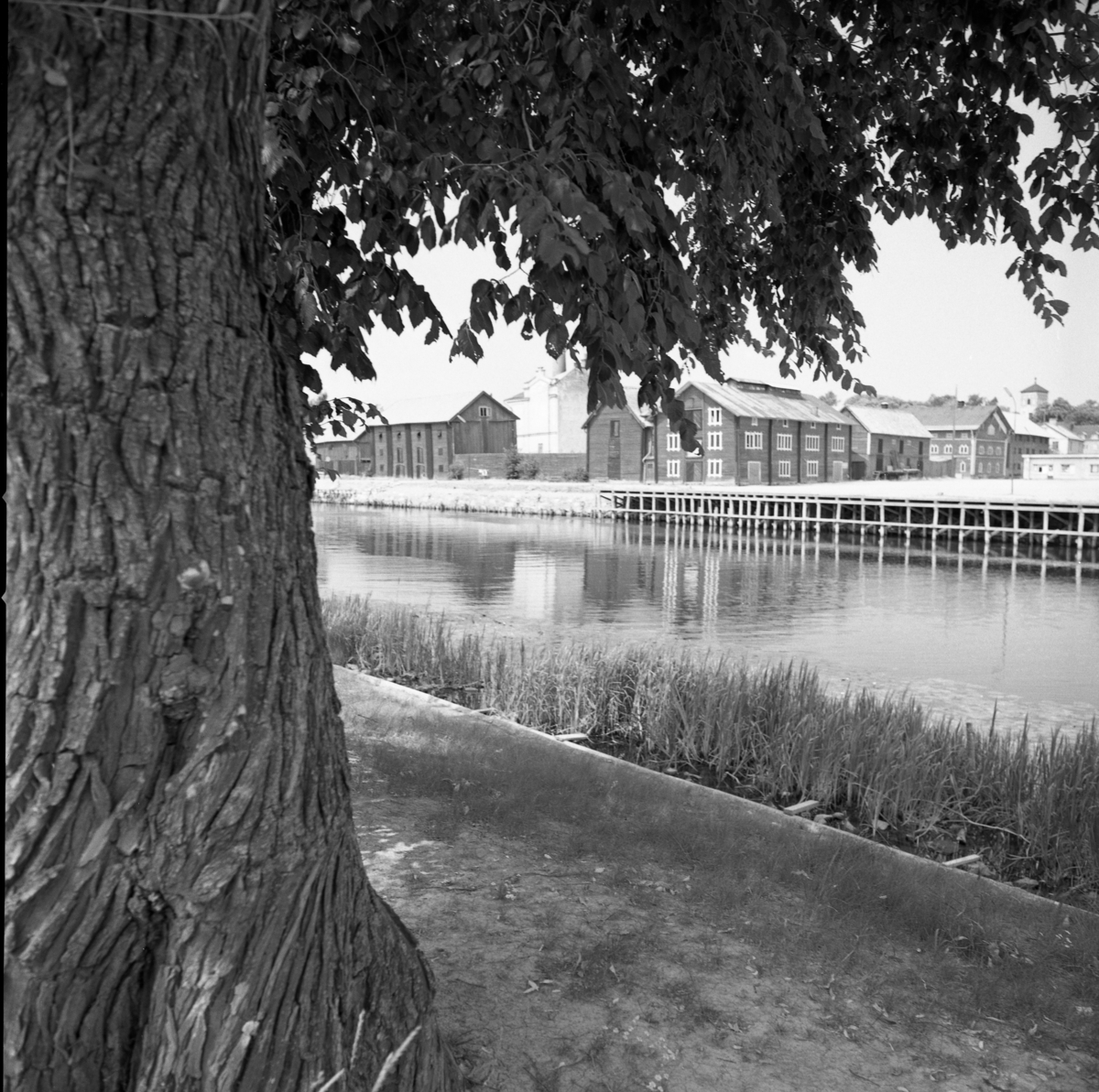 Hamnmagasinen vid kajen. I bakgrunden ses Sankt Nikolai kyrka.