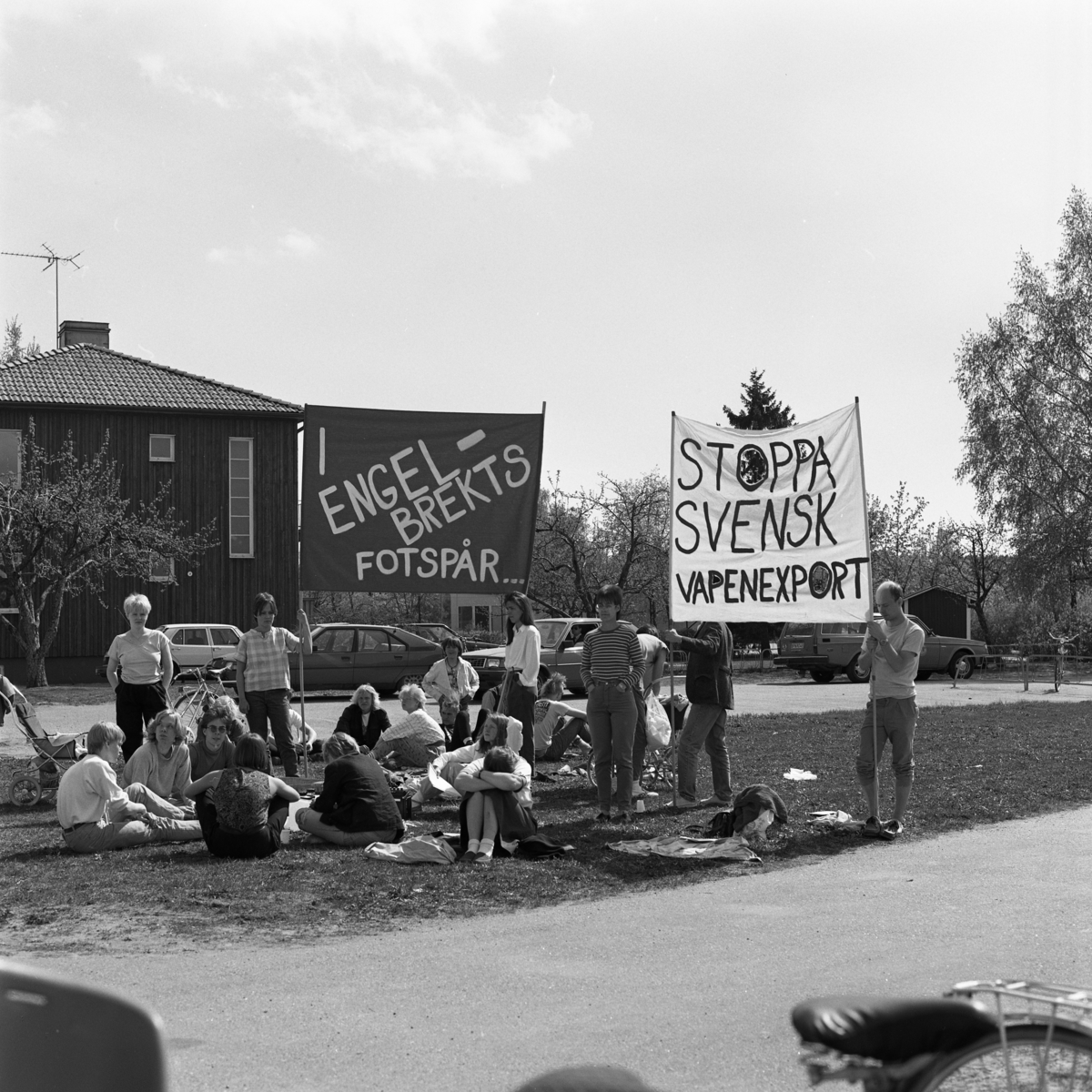 På banderollerna står "I Engelbrekts fotspår..." och "Stoppa svensk vapenexport"