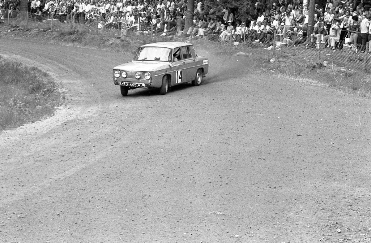 En bil sladdar i Röforsloppet. Mycket publik i backen.