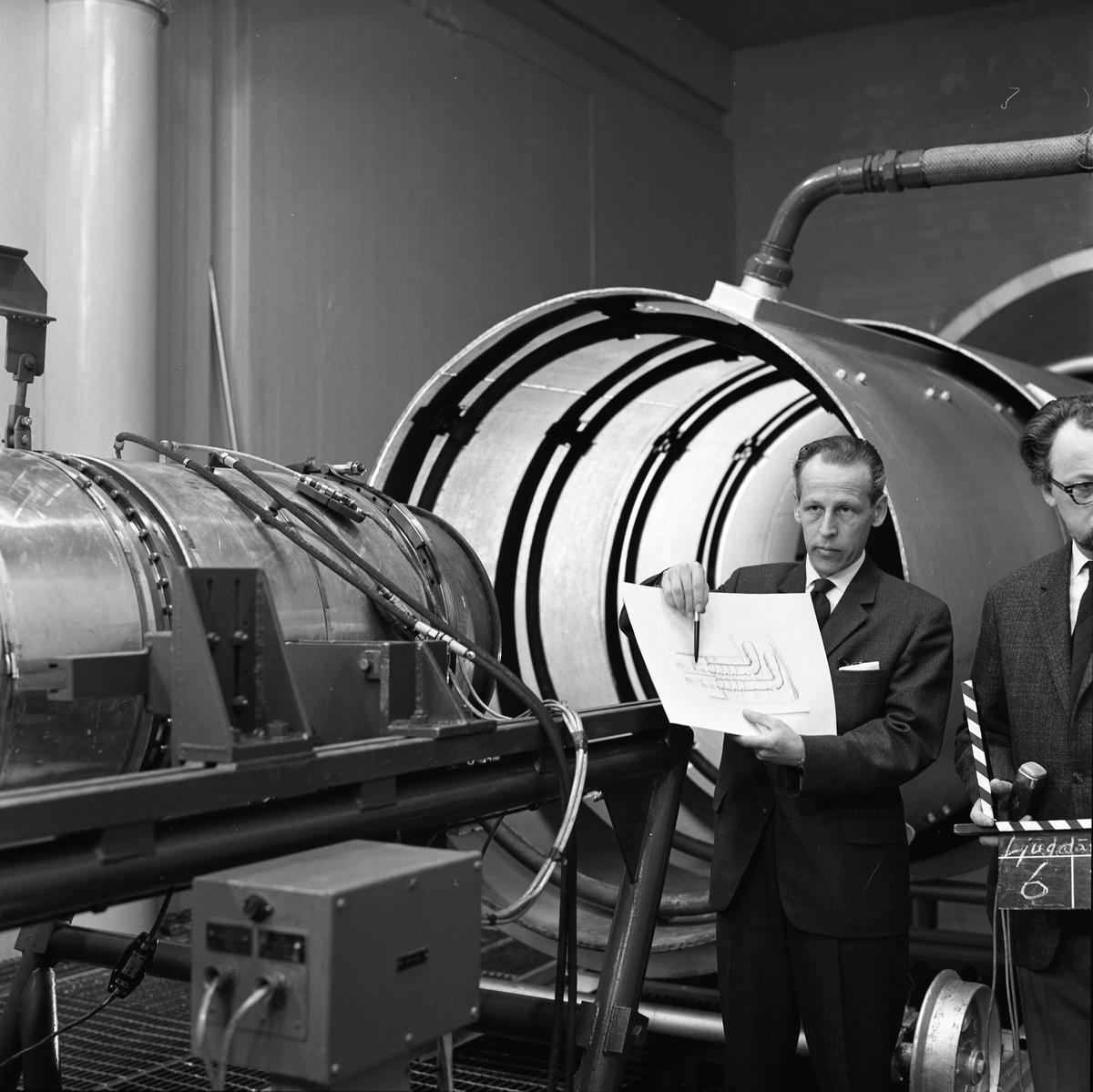 CVA. Ljuddämparen för motorprovning monteras. Man med ritning.