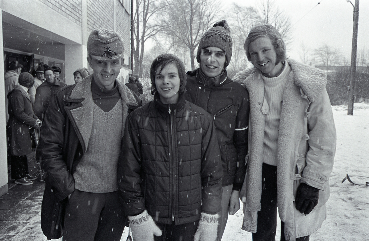 Distriktsmäterskap i skidorientering. Fyra ungdomar i ytterkläder, i snöväder. Längst till höger står Ove Thörn.