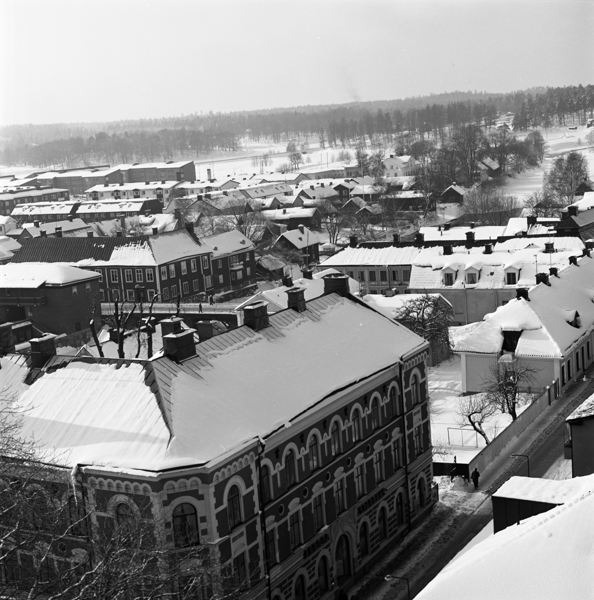Utsikt från tornet på Heliga Trefaldighetskyrkan. Närmast ses "Gamla Sparbankshuset" vid Järntorget följt av kvarteren Kungsgården och Stadsgården vid Rådhusgatan och Stora torget. Kapellbron över Arbogaån. Fastigheter längs Storgatan och Trädgårdsgatan.