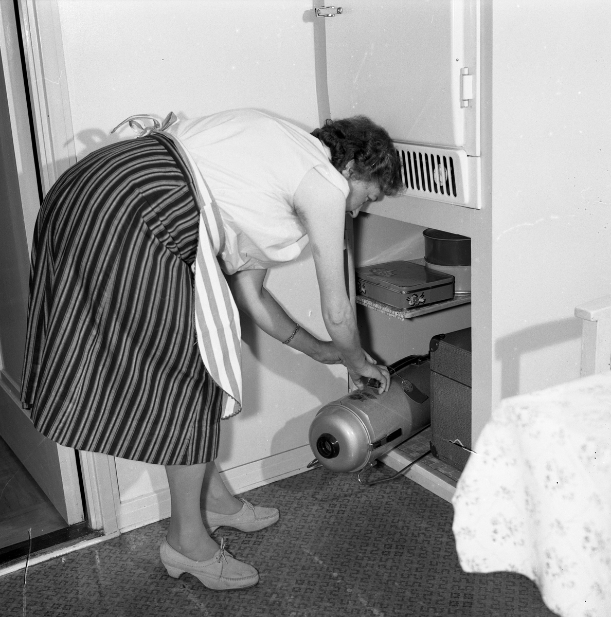Fru Blomberg i köket. Hon tar fram dammsugaren ur skåpet under kylskåpet. Där står också några kakburkar. Kvinnan har förkläde på sig.