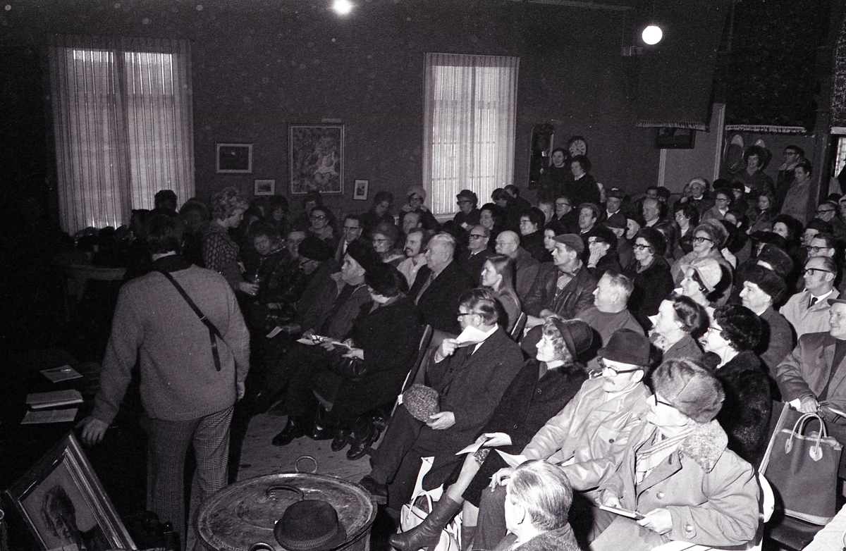 Auktion i Valskog. Publiken har ytterkläder på sig. Några män har ryssmössor, några andra har krimmelmössor. På väggarna hänger tavlor, en Amerikaklocka och flera mattor.