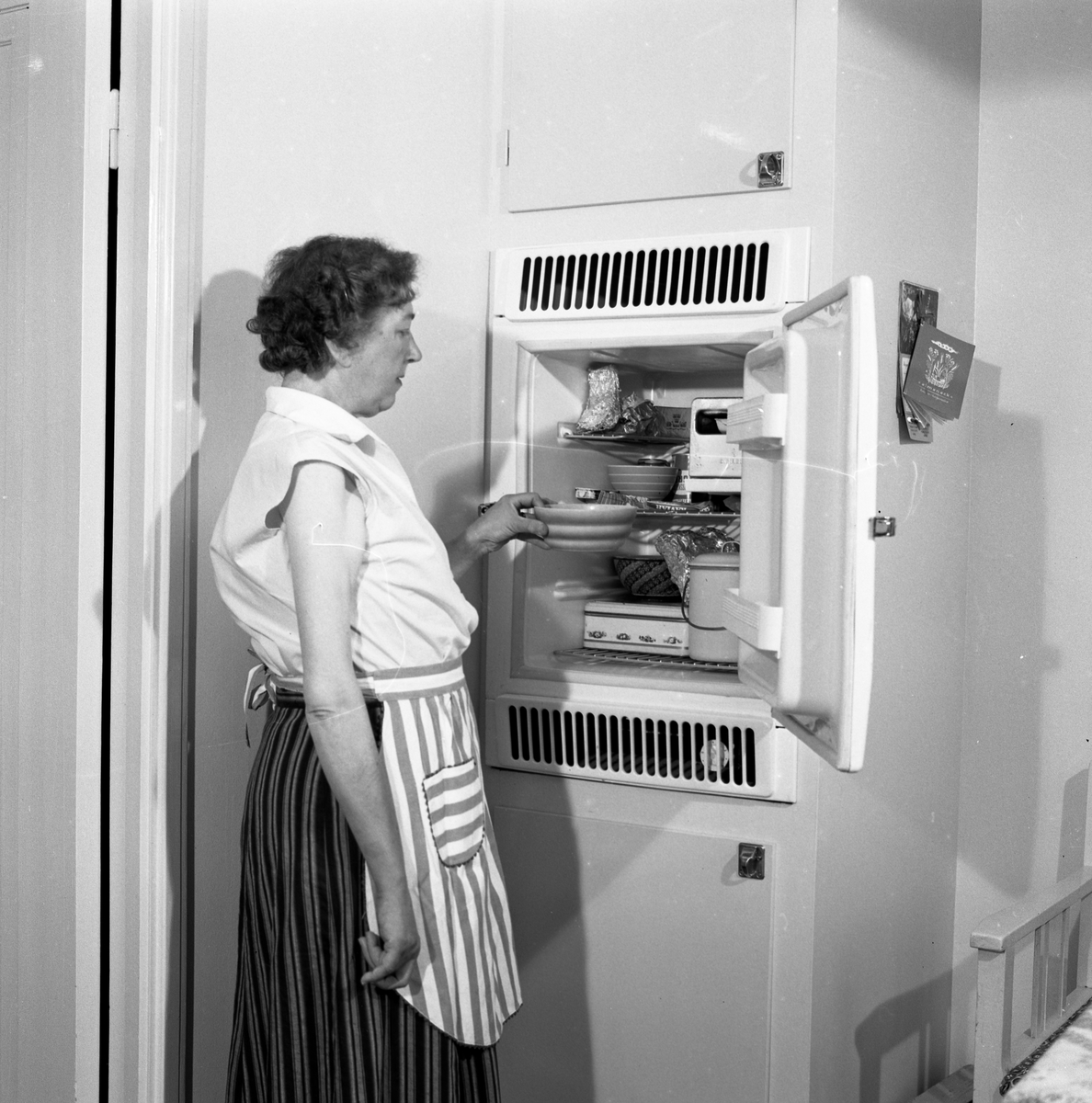 Fru Blomberg, hustru till Jakob Blomberg, på Arboga Mekaniska Verkstad, visar sitt kylskåp. I kylskåpet ses några skålar och en kakburk. En kökssoffa anas till höger.