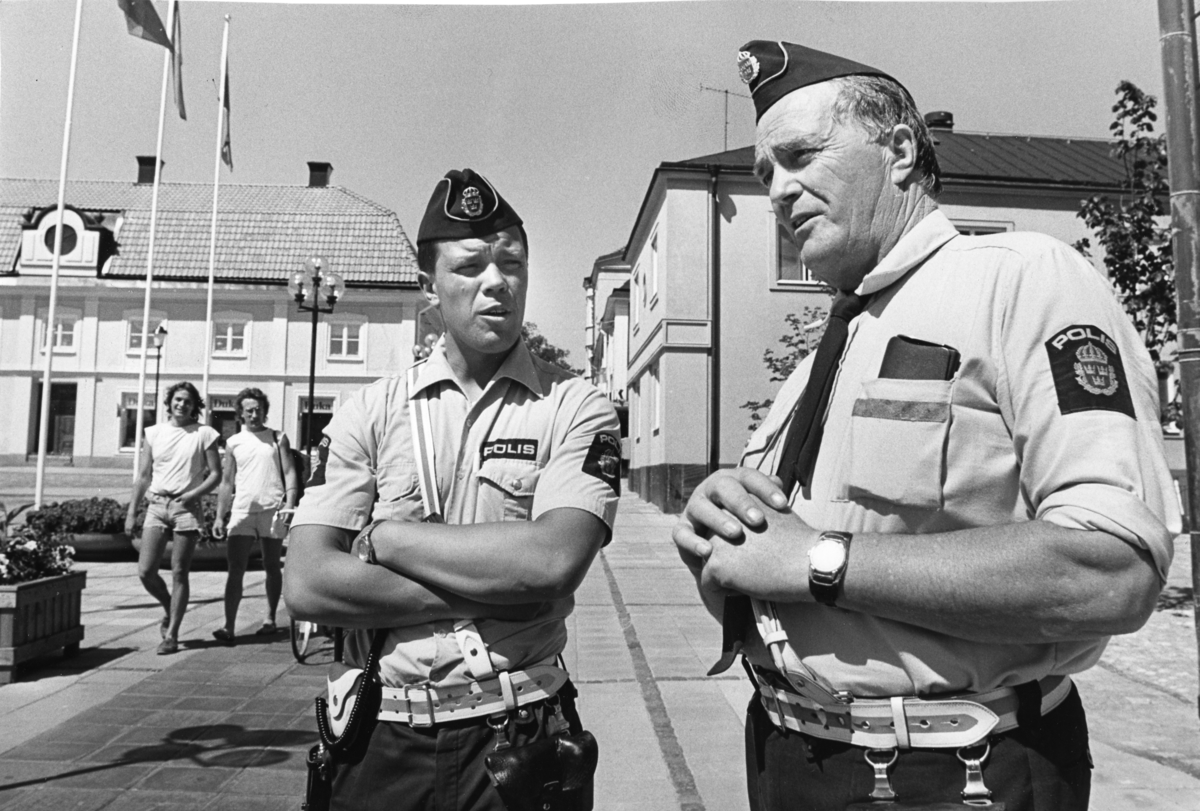 Två polismän på Stora torget. Två män i shorts ses i bakgrunden.