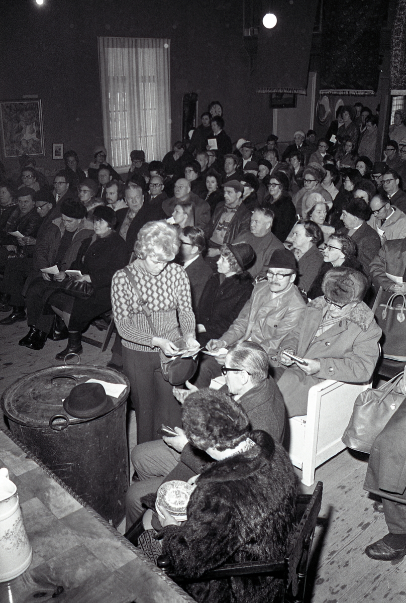 Auktion i Valskog. Publiken sitter med ytterkläderna på sig. Ryssmössor, hattar och krimmelmössor syns i mängden. På väggen hänger mattor, en Amerikaklocka och några tavlor till försäljning. En kvinna med konduktörsväska tar upp betalning.