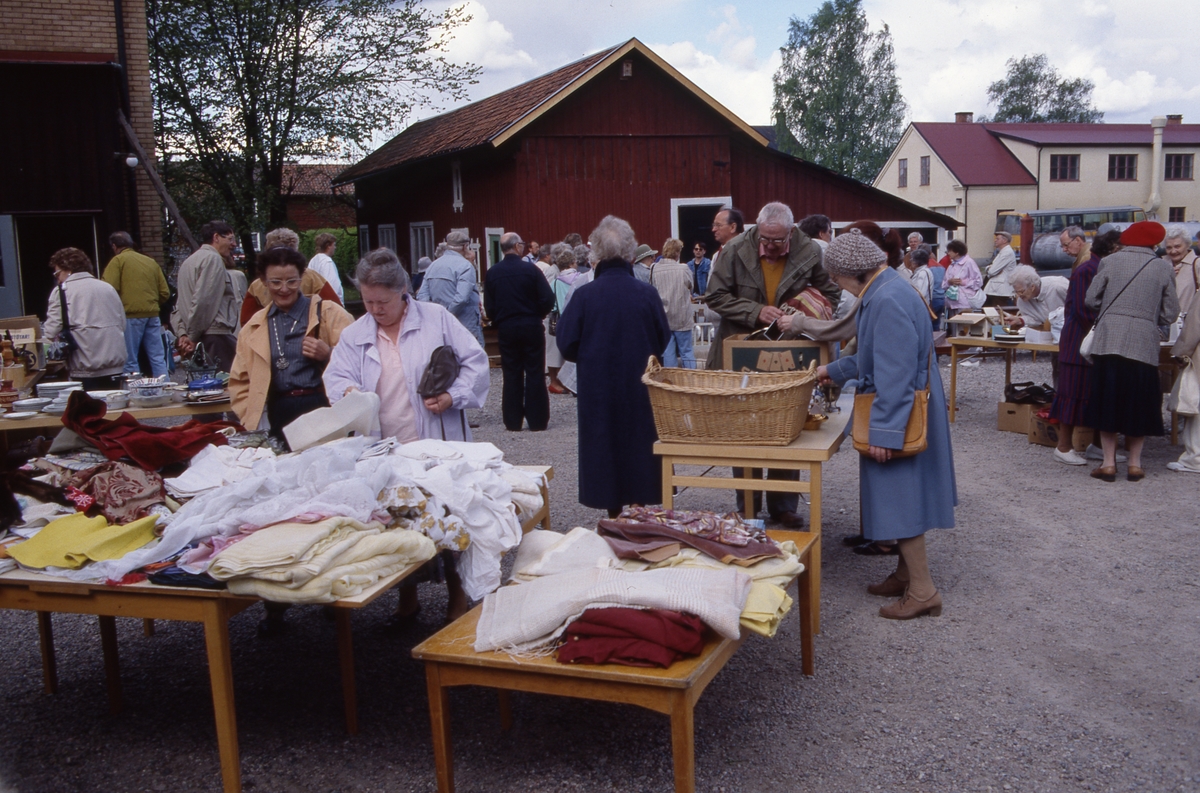 Auktion utomhus. Bord står uppställda på grusplanen. På några bord ligger textilier, på andra bord finns porslin. Människor, i ytterkläder, går runt mellan borden.