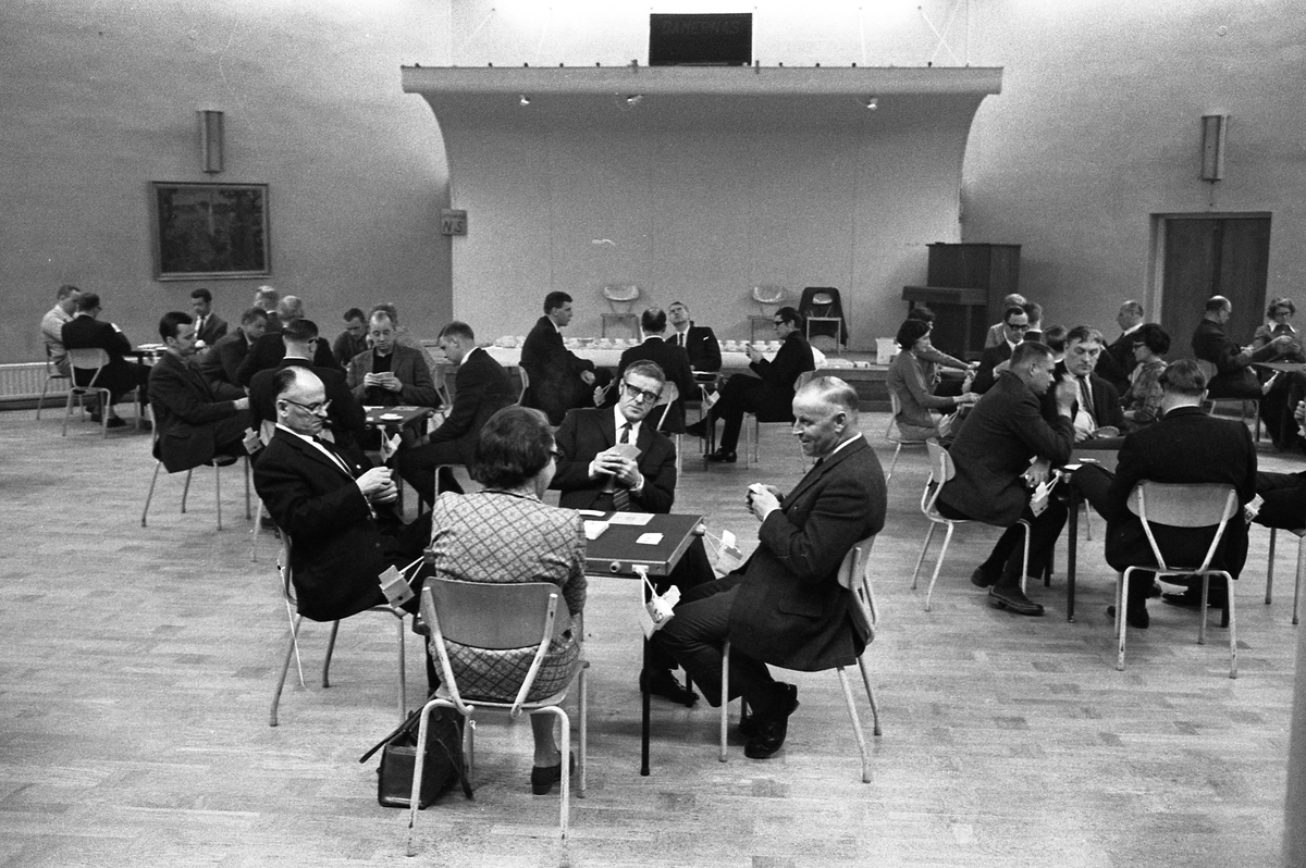 Bridge i Medborgarhuset. Människor sitter vid bord och spelar kort. I bakgrunden ses scenen.