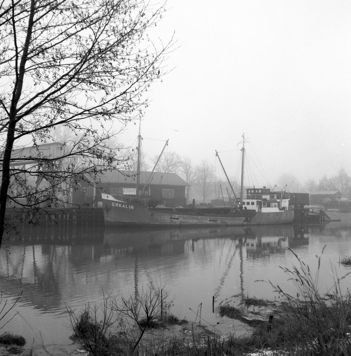 Hamnen. En stor båt, vid namn Erkalin, ligger i hamnen. Vädret är disigt. Ett hamnmagasin syns bakom båten och längst till vänster, bakom trädet, skymtar "lastningsröret" på Lantmännens silo.