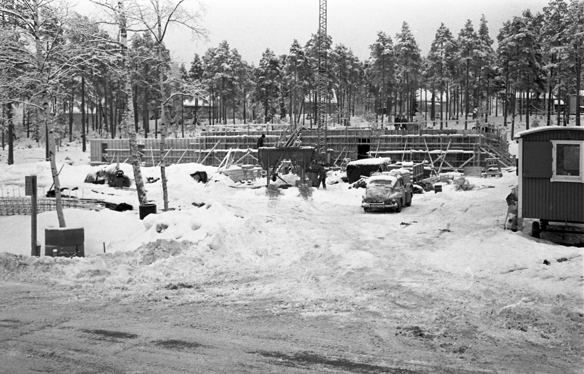 Här byggs Brattbergsskolan. Män i arbete. Byggnadsställningar. En bil och en kupa till byggjobbarna. Det är vinter och snö. Skog i bakgrunden.