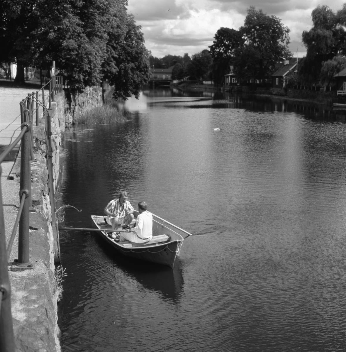 En reporter från Radio Västmanland sitter i en båt på Arbogaån. Han har en mikrofon i handen och intervjuar roddaren. Den mannen är okänd.