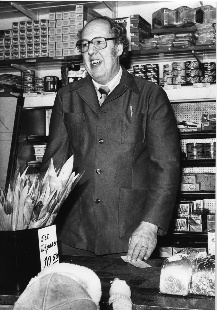 Bengt Adolfsson i butiken. Man vid disk. Bakom honom står konservburkar på hyllor. På disken står tulpaner till försäljning. Där ligger också ett par limpor. Ett litet barn sträcker fram handen med en slant.