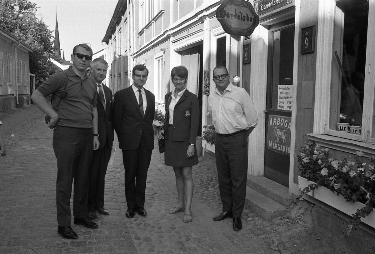 Besökare vid Arboga Maskiner på stadspromenad med Jürgen Kimmich och Kurt Åker. Platsen är Västerlånggatan.