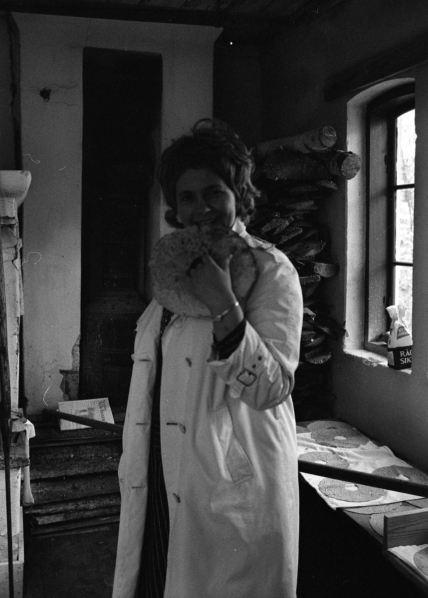 Brödbakning vid Jäders bruk. En kvinna i skyddsrock smakar på färskt knäckebröd. Vid fönstret ligger bröd och svalnar.