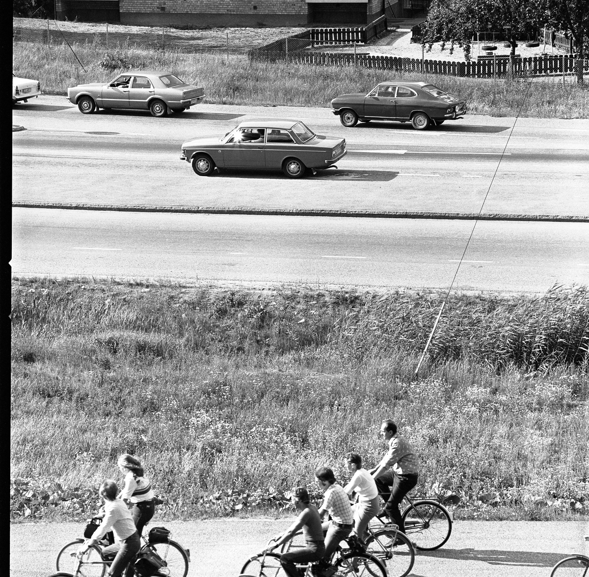 Cyklister och bilförare på Västermovägen, Brattberget. Daghemmet Biet ses i bakgrunden.