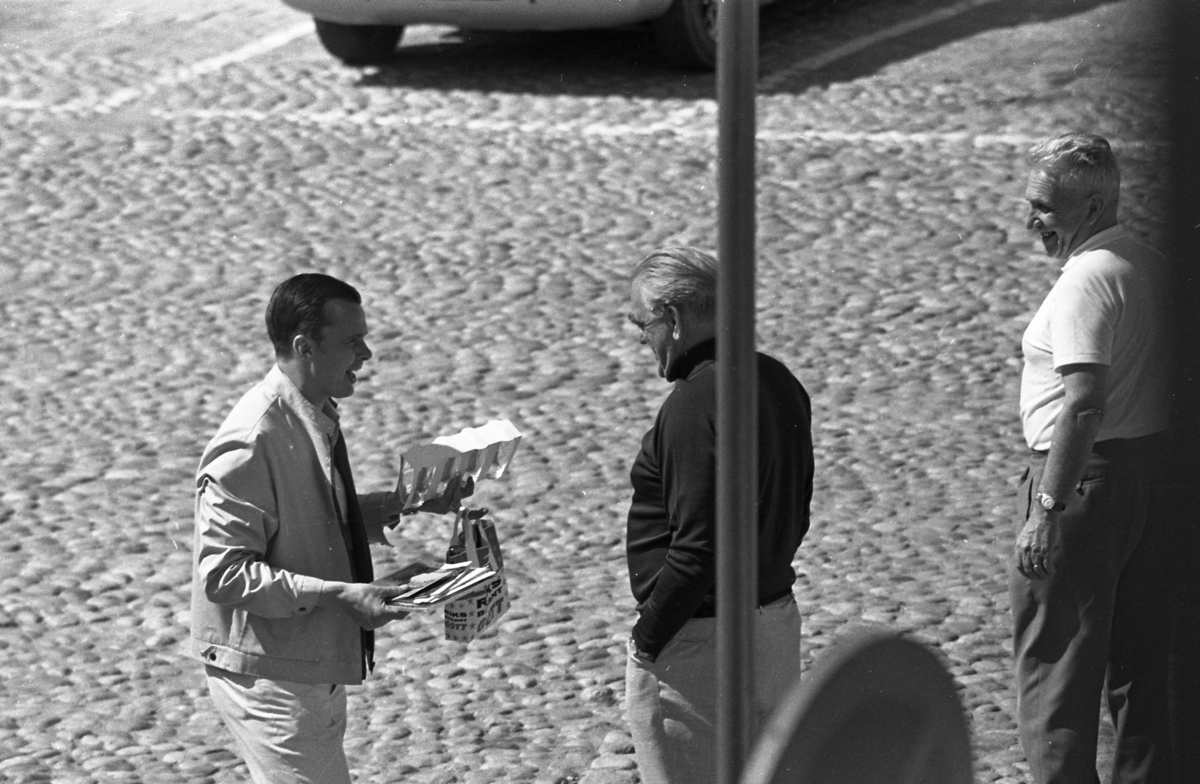 Författaren Wilhelm Moberg (i mitten) besöker Arboga. Mannen till vänster är Yngvar Gunnarsson. Platsen är Stora torget.