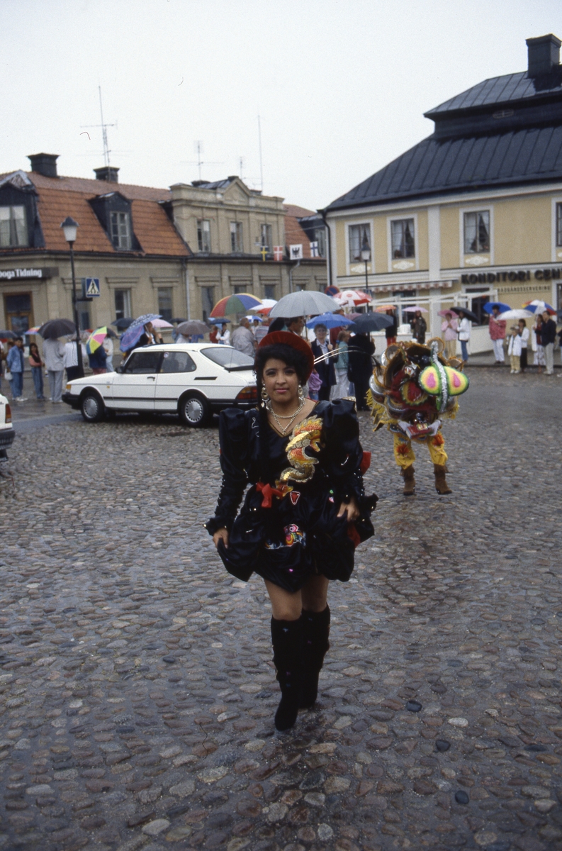 Uppklädda dansare i Arbogakarnevalen. Paraden har nått fram till Stora torget. Publiken står under paraplyer. Arboga Tidnings lokalkontor till vänster. Stadsgården med Café Centrum till höger.