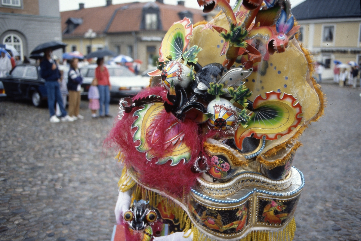 Arbogakarnevalen. Utklädd dansare på Stora torget. I bakgrunden står en liten publik, under paraply, och ser på.