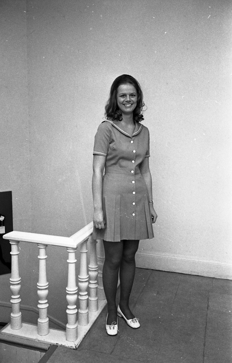 Öhrman & Melander ska ha modevisning. Kerstin Löfgren är en av mannekängerna. Här visar hon en helknäppt klänning med lagda veck i kjolen. Hon står utanför firmans kontor.