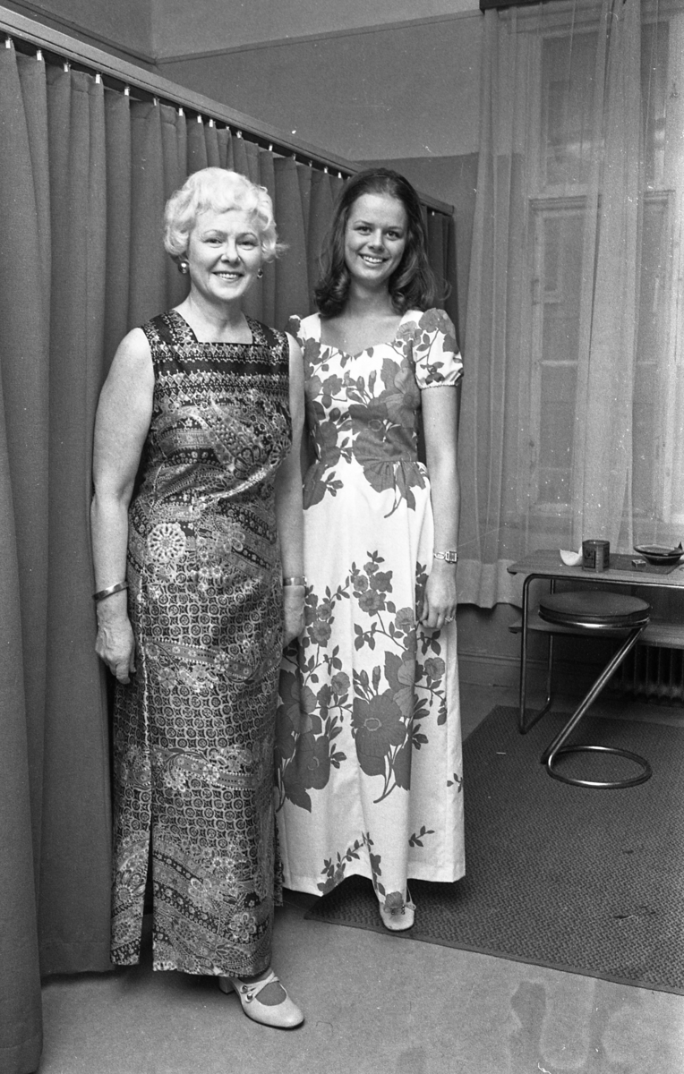 Det är dags för Öhrman & Melanders modevisning. Här står Harriet Larsson och Kerstin Löfgren i var sin långklänning. Harriet arbetar på Öhrman & Melander, där bilden är tagen.