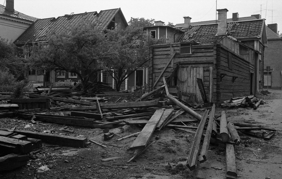 Rivning av en fastighet på Nygatan. Huset är en del av Glasbruksgården. Bräder och tjocka timmerstockar ligger på gården. Fruktträden står i bråten.