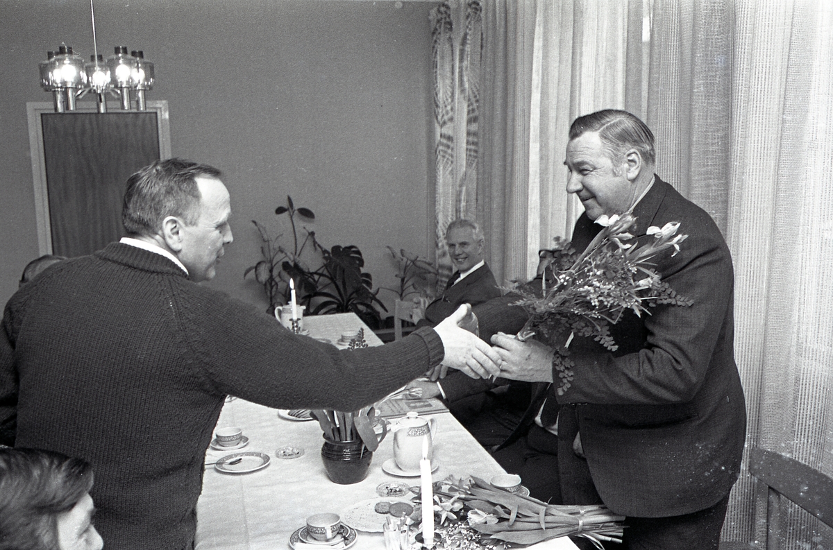 CVA och UHF avtackar veteraner. Män sitter runt ett bord. Det är dukat med kaffe och kakor. En man mottar en blombukett.