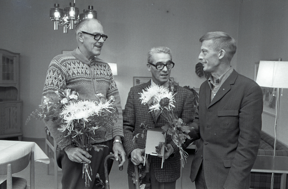 Pensionsavtackning på CVA. Två män får var sin blombukett.