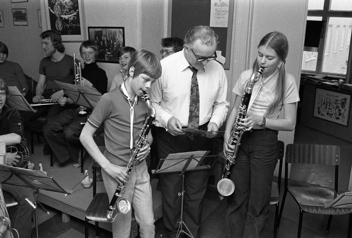 Ungdomsorkestern övar. Karl-Axel Göransson instruerar Per Candell och Anna-Karin Eriksson. Grabben i mörk polo, med trumpeten i knät, är Anders Gelinder.
