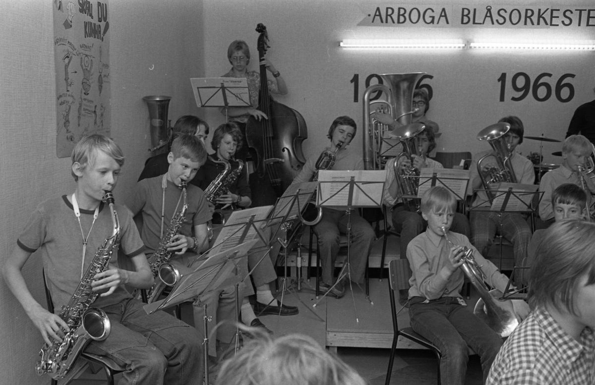 Ungdomsorkestern repeterar. Saxofonisten, närmast i bild, är Thomas Jäderlund. Pär-Erik Modigh spelar kontrabas. På valthorn Göran Torshage och Anders Garpered.