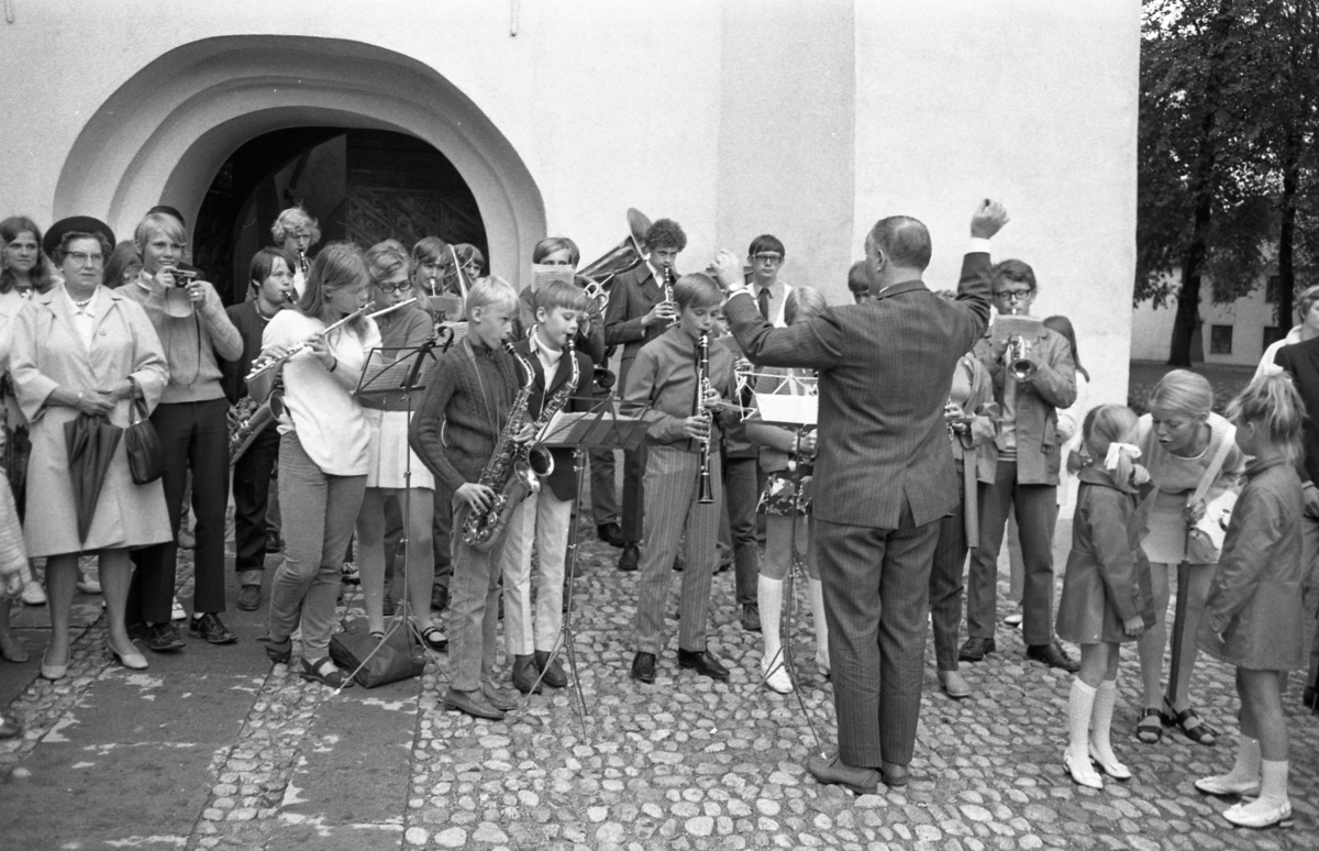 Det är studentdag! Utanför Heliga Trefaldighetskyrkan spelar ungdomsblåsorkestern.