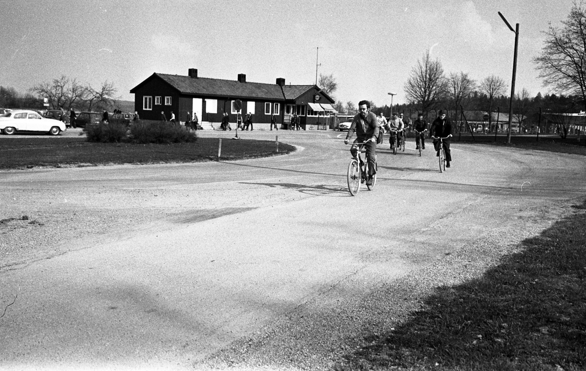 Arbetsdagen är slut. Män cyklar hem från CVA, Centrala Verkstaden Arboga. I bakgrunden ses bilparkeringen, byggnaden där vakten sitter och en SAAB som är på väg ut genom grinden.