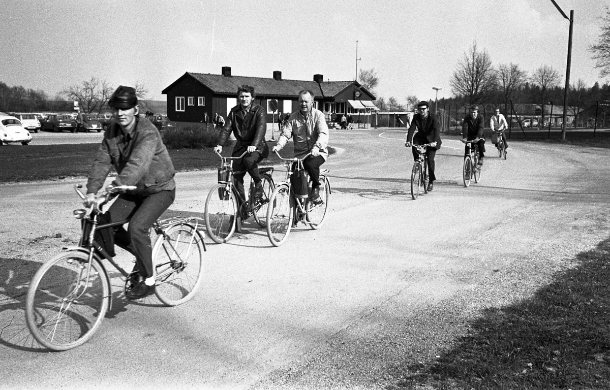 Arbetsdagen är slut, på CVA, Centrala Verkstaden Arboga. Männen cyklar hem med sina matväskor på styret. Nummer två, från vänster, är Yngve Nilsson och nummer fyra är Henry Fredriksson.