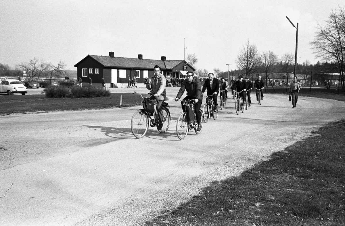Arbetsdagen är slut på CVA, Centrala Verkstaden Arboga. Ingenjörer och verkstadsarbetare cyklar hem, med portföljer på pakethållaren eller matväskan på styret. I bakgrunden ses "vakten" (byggnaden till vänster) och bilparkeringen.