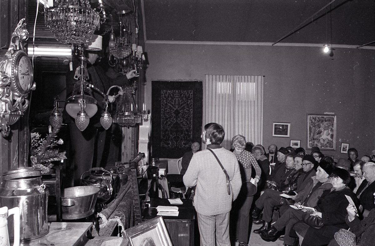Auktion i Valskog. Publiken sitter med ytterkläder och mössor på sig. På väggarna och på scenen visar försäljningsobjekten; en pendyl, kristallkronor och andra lampor, bunkar, kannor, matta och tavlor. De två personer som står upp, har pengaväskor hängande på axeln. De tar hand om betalningen.