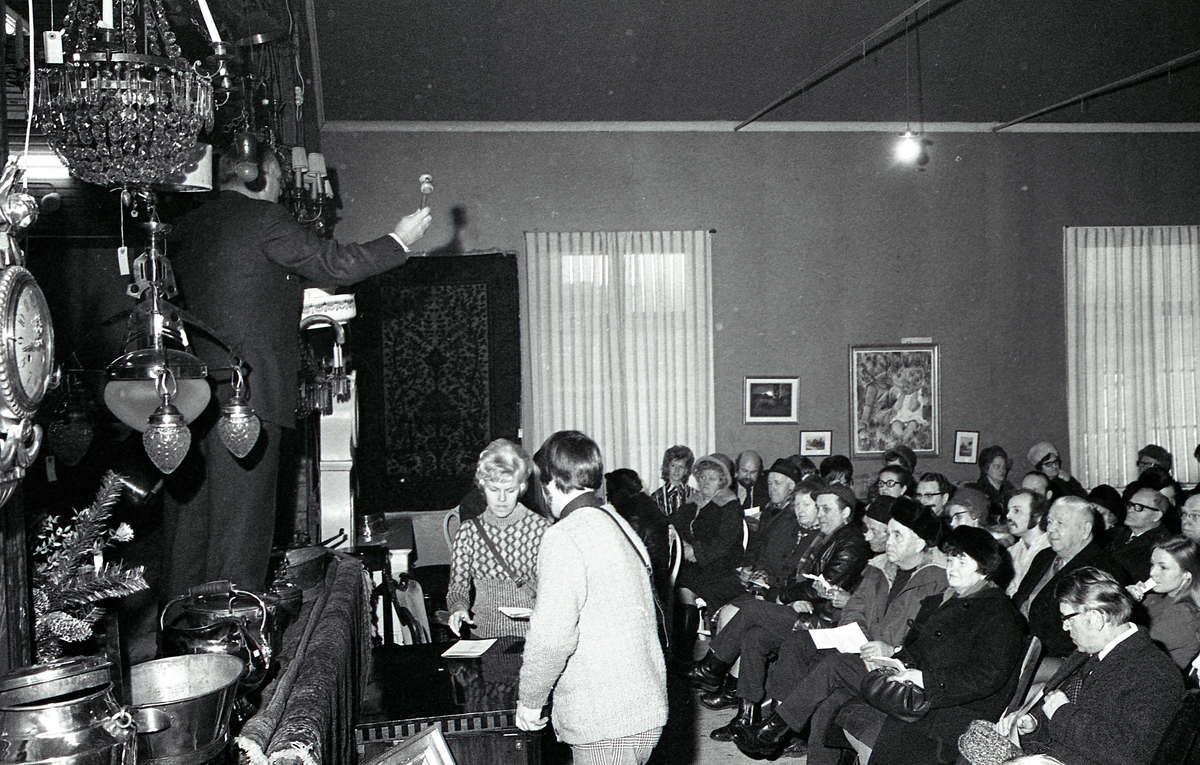 Från taket hänger kristallkronor och andra lampor. På och framför scenen trängs föremålen som är till försäljning; pendyl, kopparbalja, kolkanna diverse annat.