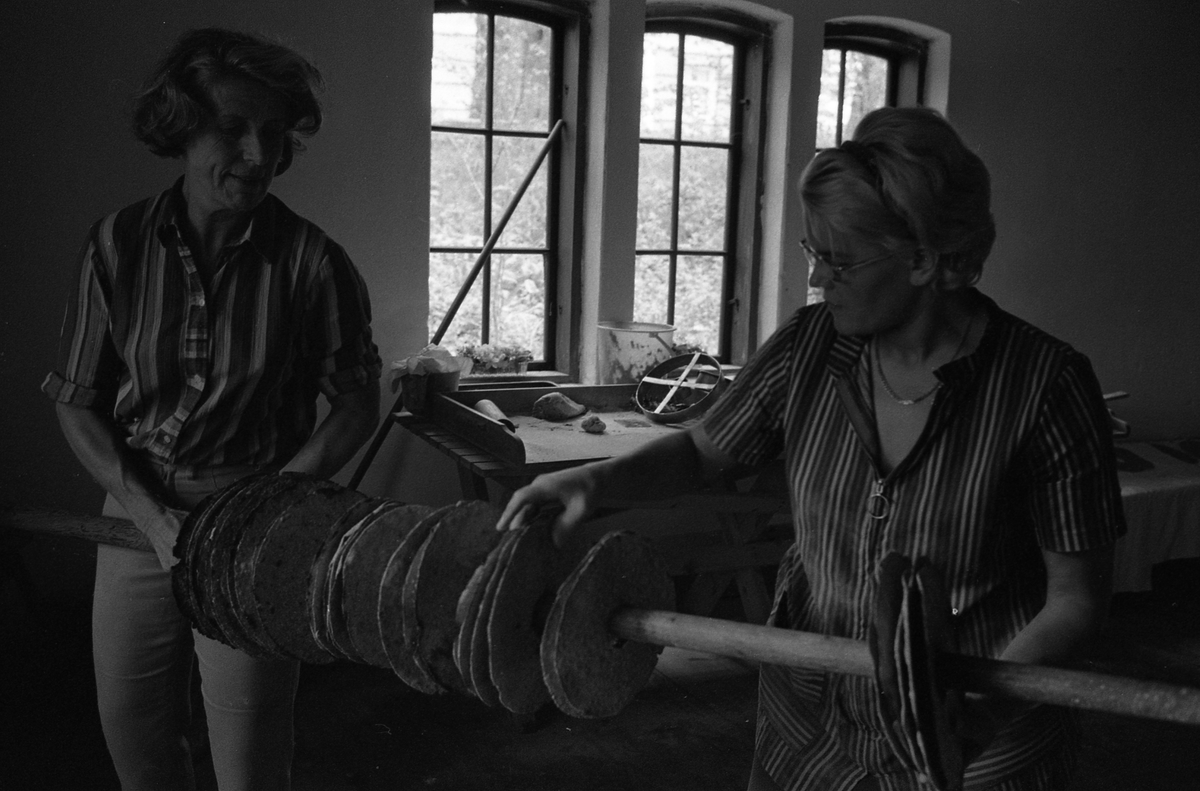 Brödbakning vid Jäders bruk. Två kvinnor i en bakstuga/bagarbod. De håller en stång med uppträdda knäckebröd mellan sig. Vid fönstret finns ett bakbord med brödkavel, bunke och brödkavel.