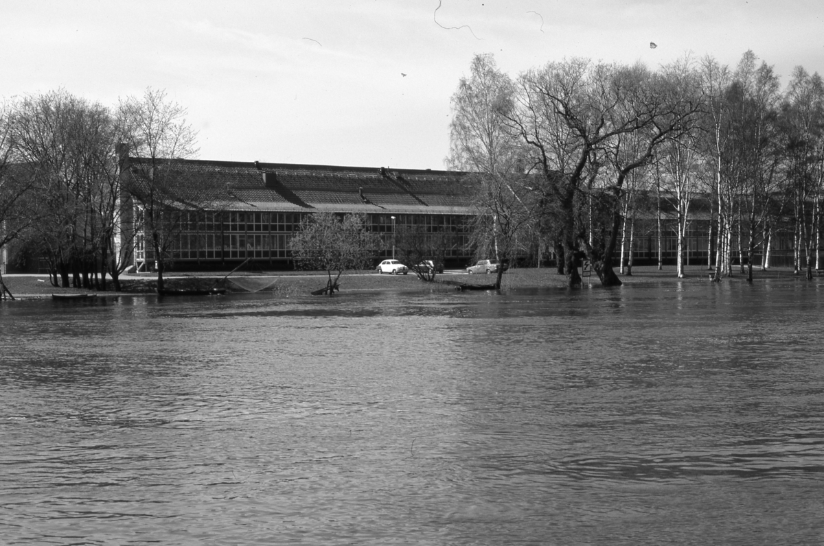 Äldreboendet Stabbaren, senare Strandgården, på Storgatan. Högt vatten i Arbogaån. En håvbåt ligger i ån. Bilar står på parkeringen.