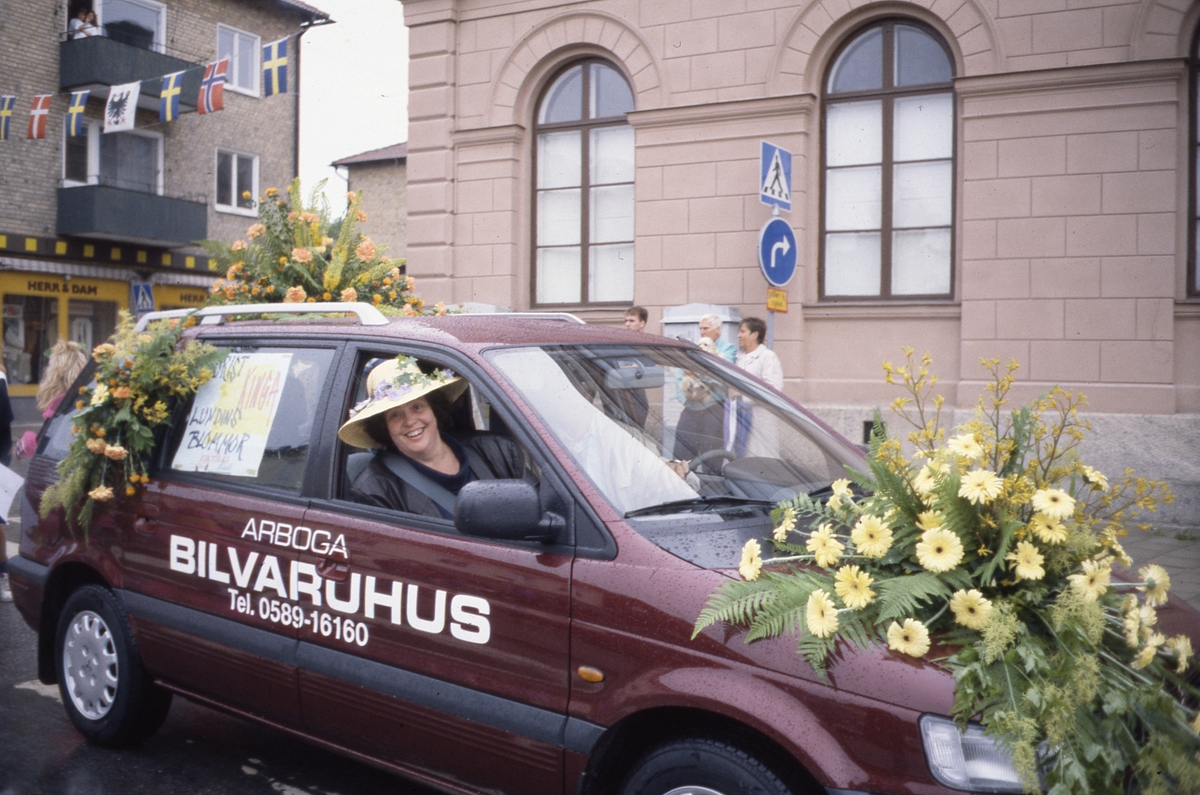 Arbogakarnevalen. Paraden har nått Hökenbergsgränd. Här kommer en bil dekorerad med blommor från Lundins blommor. På passagerarsätet sitter Ulla Lundin.
