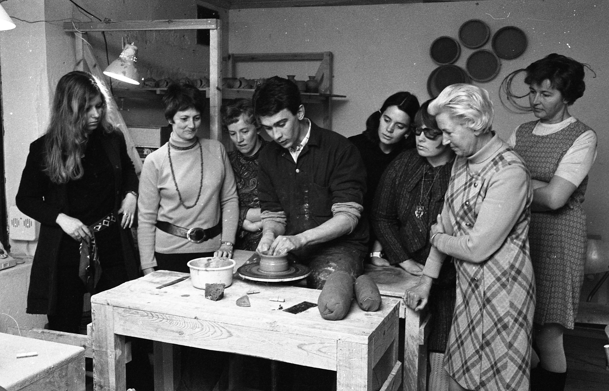 Keramikkurs hos Ulf Johansson. Här visar han hur man drejar. Kvinnan längst till vänster är Eva-Lita Harlin Alm. De tre kvinnorna längst till höger är: Ulla Hellström (med halssmycket), Karin Liljeborg (kallad "Noppan", i rutig klänning) och fru Oscarsson längst till höger.