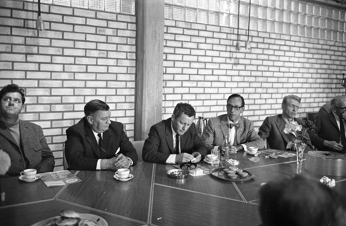 Från vänster: Torbjörn Harlin (facklig representant), okänt namn (fackligt ombud för Metallarbetarförbundet), Kjell-Olov Feldt (handelsminister), okänd, Olle Göransson (riksdagsman från Arboga), okänd.