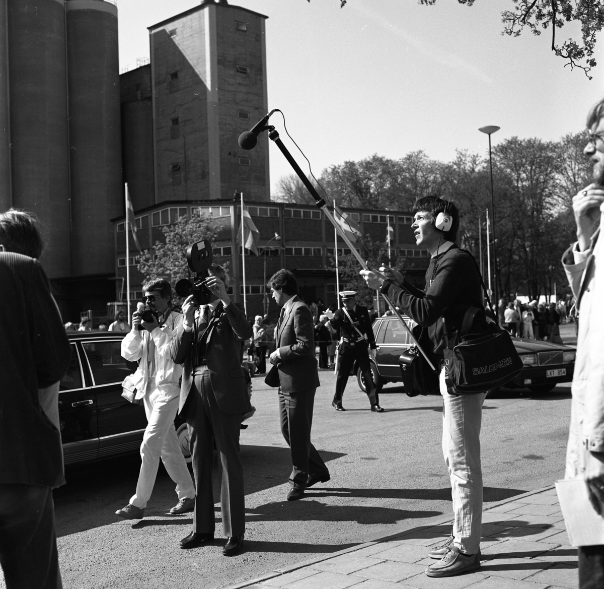 Pressen och polisen vid järnvägsstationen. Allmänheten trängs för att se kungaparet och riksdagsledamoterna som anländer med tåg. Den ljusklädde fotografen är Björn Johansson på Arboga Tidning.