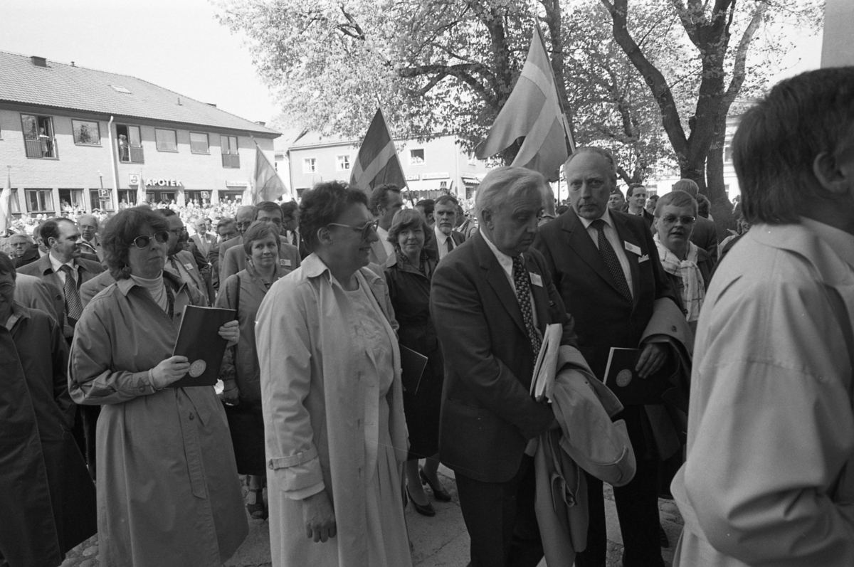 I bakgrunden ses Apoteket och Bellis Blommor. Allmänheten hålls på behörigt avstånd, på andra sidan Järntorget. Flaggorna vajar.
