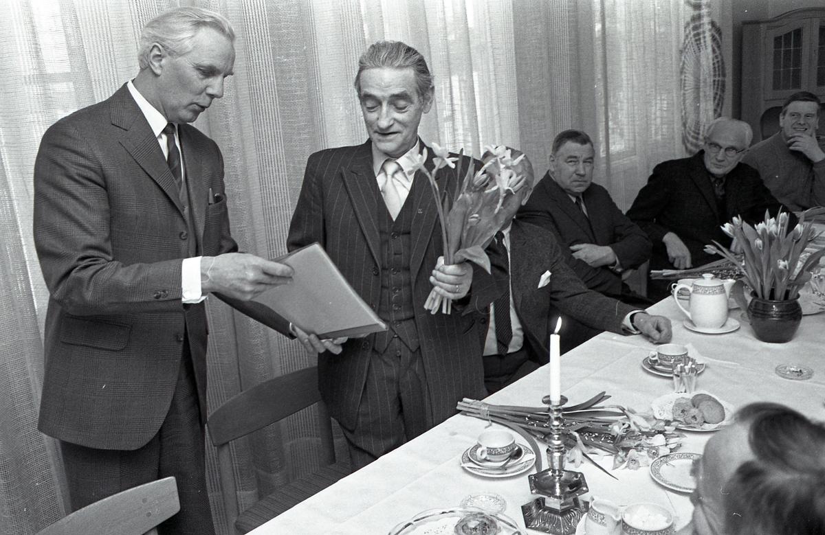 CVA och UHF avtackar veteraner. Kostymklädda herrar vid ett dukat bord. En man överlämnar ett papper till en man som håller i en blombukett. Han har fått påskliljor och det står tulpaner i en vas på bordet. Bordet är dukat med kaffe och kakor. En ljusstake står på bordet.