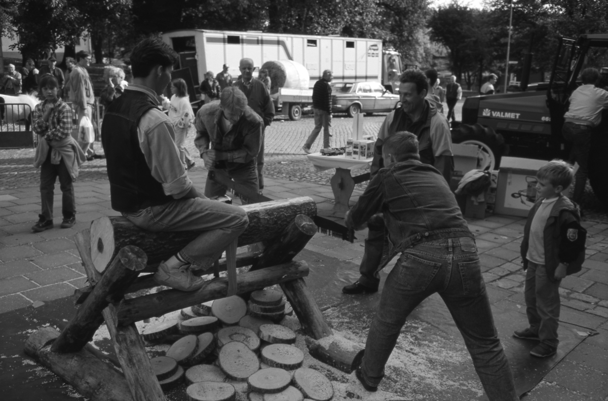Evenemanget "Bonde på stan" på Järntorget. Två unga män hjälps åt att såga. En traktor ses till höger. I bakgrunden, till vänster, ses en ponny i en liten hage. En lastbil är parkerad intill kyrkparken. Människor strosar mellan aktiviteterna.