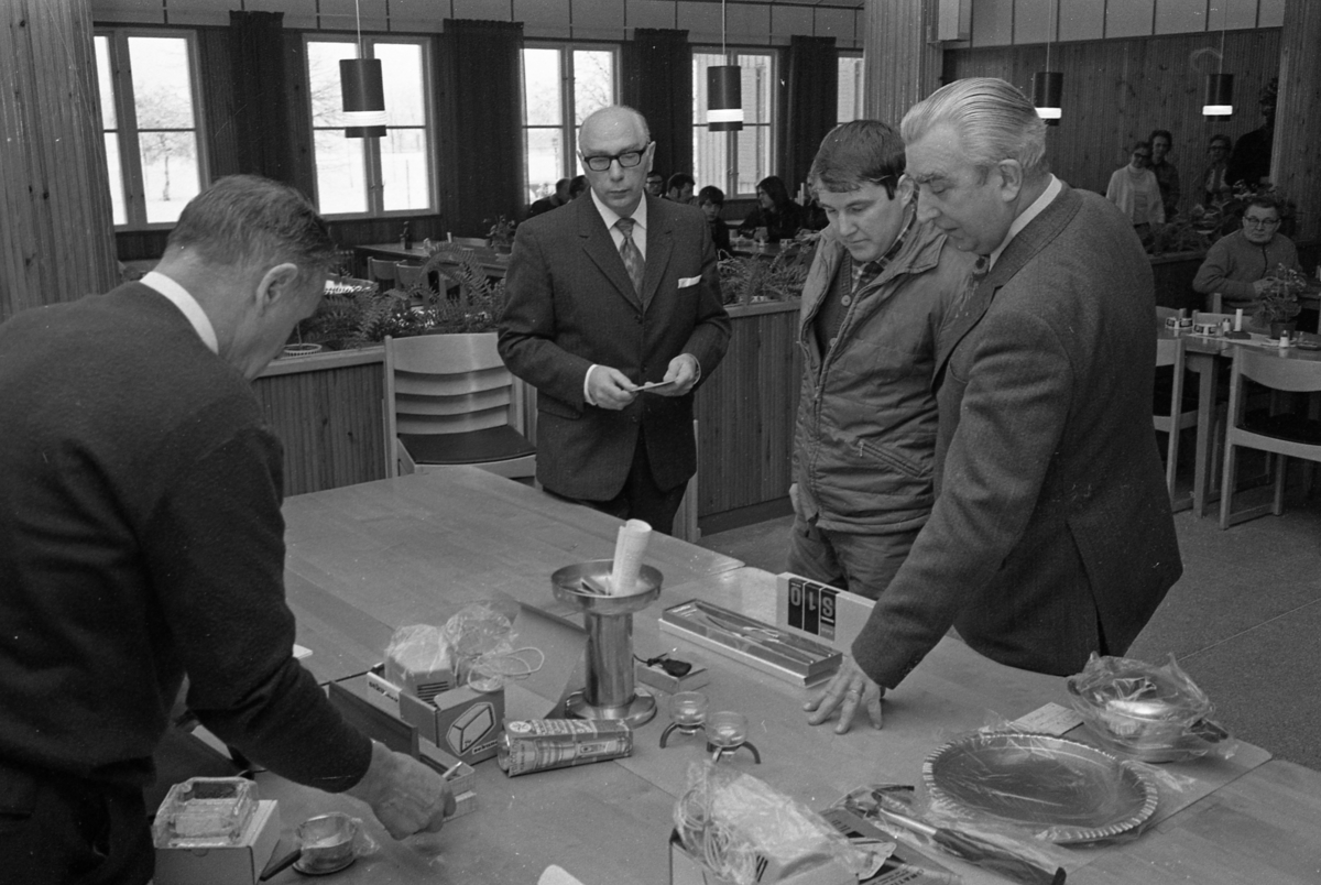 Några män vid ett bord med priser; en vattenmätare, en hammare, ett kakfat med mera.