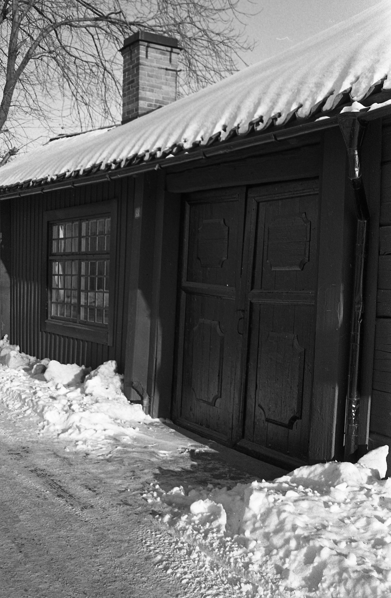 Del av ett boningshus på Ahllöfsgatan. Huset har dubbeldörr och spröjsat fönster. Snön ligger på taket och det är snödrivor på var sida om porten. Porten har ett handtag och en stor nyckel i låset.