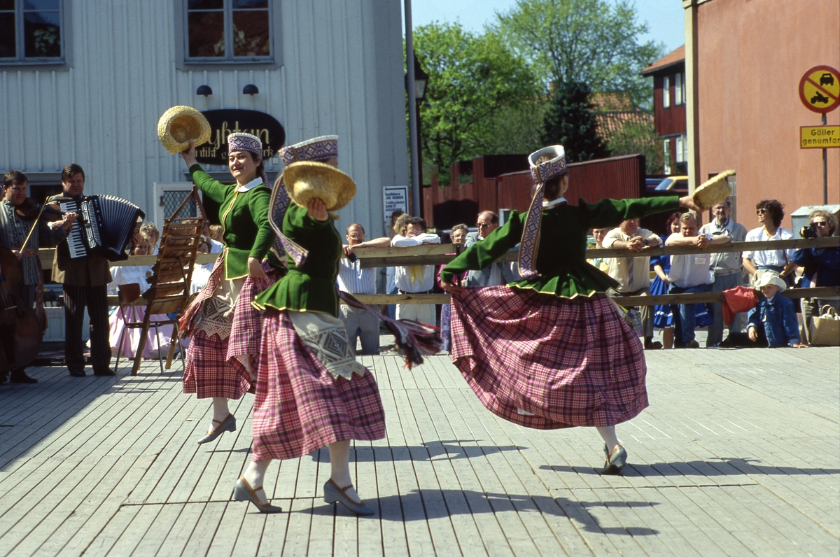 En utländsk dansgrupp uppträder på Stora torget. Tre kvinnor dansar, en man spelar fiol och en annan man spelar dragspel. Publiken står nedanför dansgolvet och tittar på. I bakgrunden syns butiken Lyktan och infarten till Västerlånggatan.